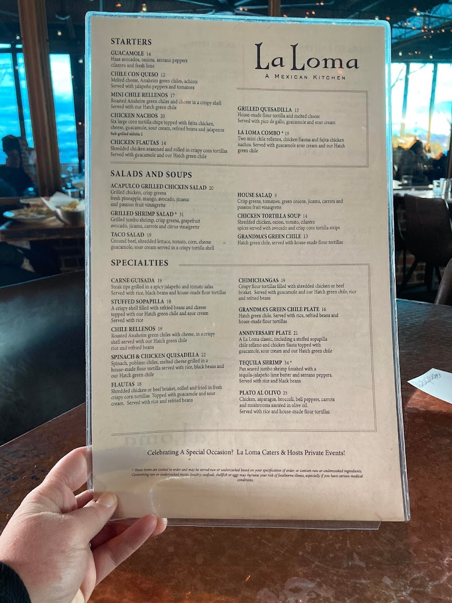 We have been going to the same Mexican restaurant for over 30 years. It’s been our favorite that long. I think today we found a new favorite. The food just tasted... like quality. I don’t know if that makes sense. Better ingredients, more home made. Mexican can be really heavy. This was delicious and we left feeling so full only because we couldn’t stop eating! From the chips and salsa to the mains. We loved the chips and salsa, the iced tea was perfect, the brisket chimichanga was fantastic (husband is bringing the chicken one home) and my carnitas were amazing. The tacos came deconstructed, which is great cuz I could only eat one! The leftovers I’m taking home should feed both of us for lunch tomorrow! Our server Ryan was really nice but we found the service to be a bit slow and kind of forgetful. There is plenty of parking, lots of seating and lots of views and it’s accessible. We highly recommend La Loma.